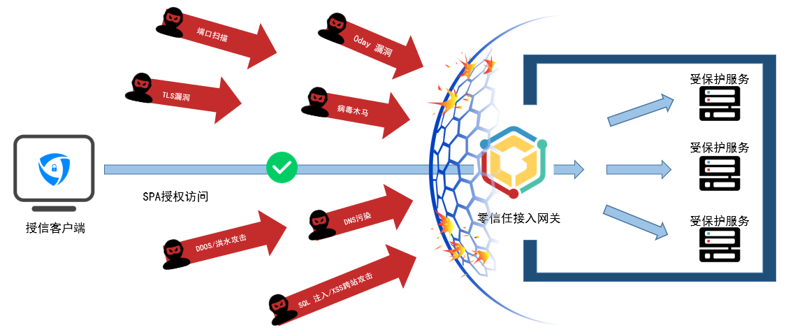 受保護(hù)的服務(wù)對(duì)未授權(quán)用戶及設(shè)備完全不可見(jiàn),無(wú)法通過(guò)端口掃描發(fā)現(xiàn)服務(wù)。 這些服務(wù)默認(rèn)在互聯(lián)網(wǎng)實(shí)現(xiàn)“隱藏“。嚴(yán)格的終端單包敲門機(jī)制, 確保只有認(rèn)證過(guò)的用戶及設(shè)備才能訪問(wèn)受保護(hù)服務(wù)。