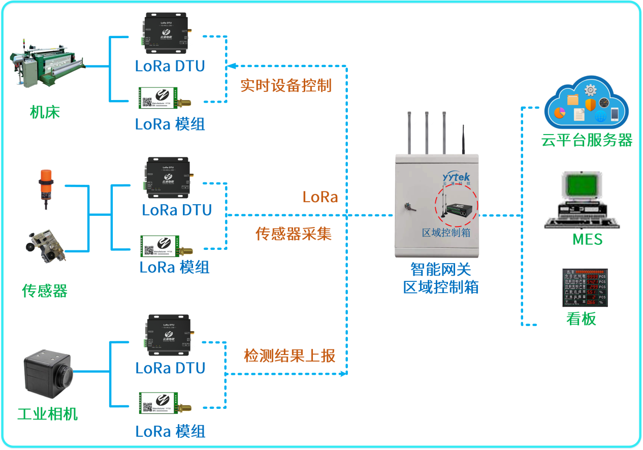 在工廠內(nèi)的各個終端節(jié)點(diǎn)(傳感器、工業(yè)設(shè)備、工業(yè)相機(jī))使用LORA DTU和LORA模組升級設(shè)備和傳感器,使設(shè)備具備無線傳輸能力,實現(xiàn)對生產(chǎn)數(shù)據(jù)的實時上報和操作指令接收。通過云涌智能無線網(wǎng)關(guān)對著這些終端節(jié)點(diǎn)進(jìn)行數(shù)據(jù)的采集和接收,再由網(wǎng)關(guān)進(jìn)行數(shù)據(jù)分析和協(xié)議轉(zhuǎn)換,與上層的不同業(yè)務(wù)系統(tǒng)進(jìn)行數(shù)據(jù)的交互。