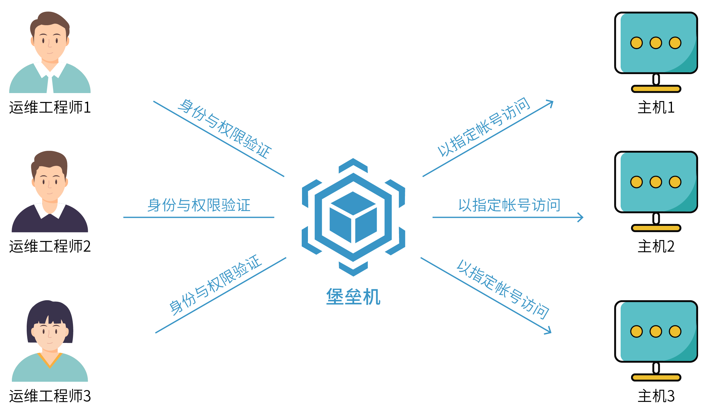 2.維護人員的權限無法基于最小權限分配原則管理,難以實現更細粒度的命令級權限控制,不同背景運維人員的行為給信息系統安全帶來較大風險,系統安全性無法充分保證;