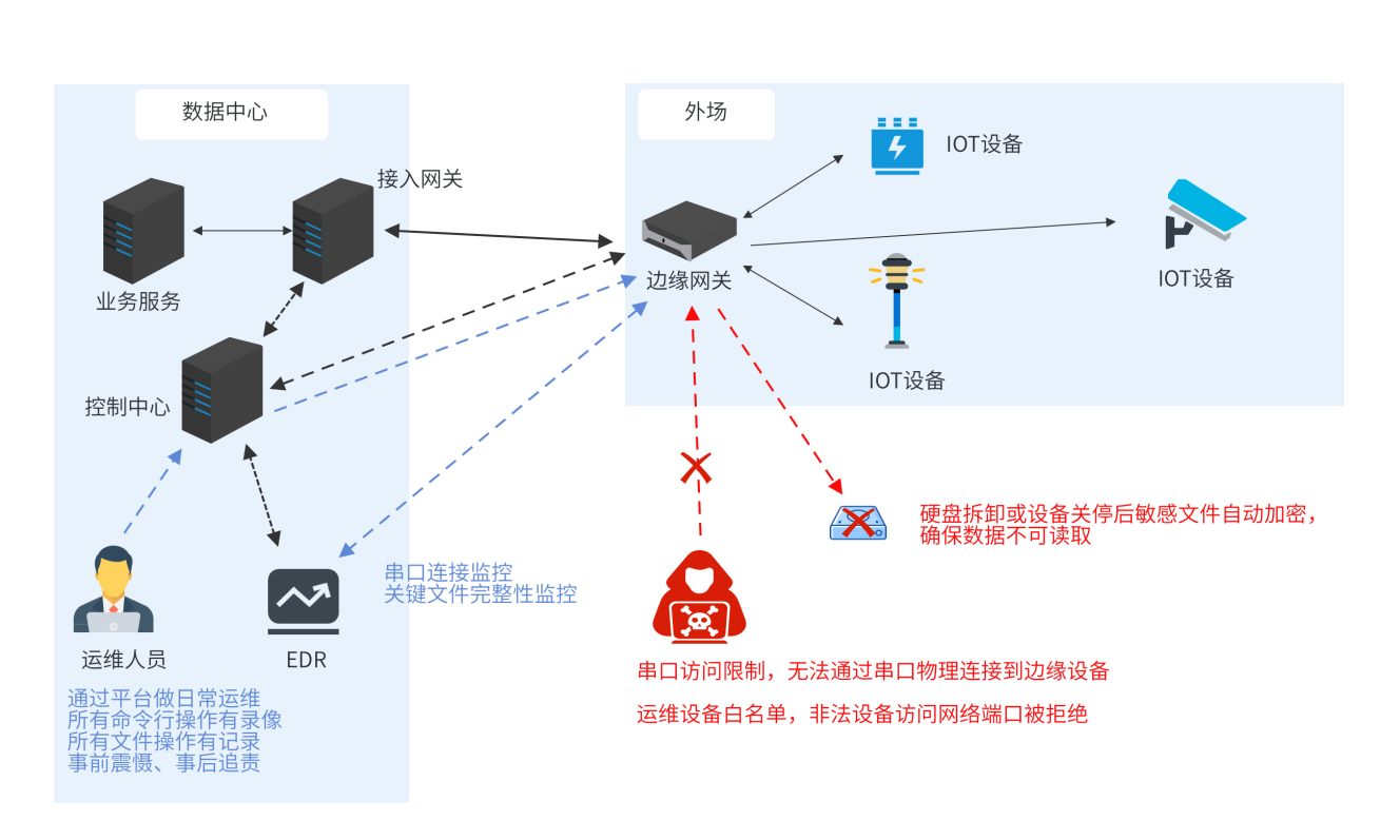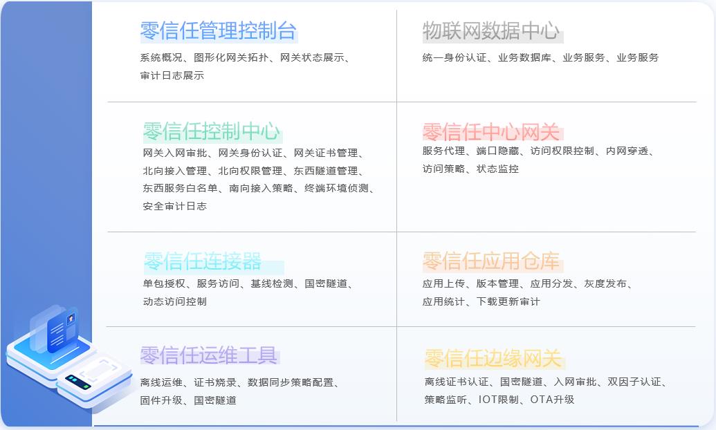 平臺由邊緣網(wǎng)關(guān)代理程序、網(wǎng)關(guān)離線運(yùn)維工具、控制中心、接入網(wǎng)關(guān)、應(yīng)用倉庫等模塊組合而成。產(chǎn)品核心功能包括邊緣網(wǎng)關(guān)身份認(rèn)證、網(wǎng)關(guān)出入站訪問控制、網(wǎng)關(guān)間微隔離控制、邊緣應(yīng)用管理、網(wǎng)關(guān)安全運(yùn)維、網(wǎng)關(guān)數(shù)據(jù)存儲透明加解密等。同時(shí)平臺保護(hù)網(wǎng)關(guān)與北向數(shù)據(jù)中心的訪問安全,包括端口隱藏,通訊加密等。