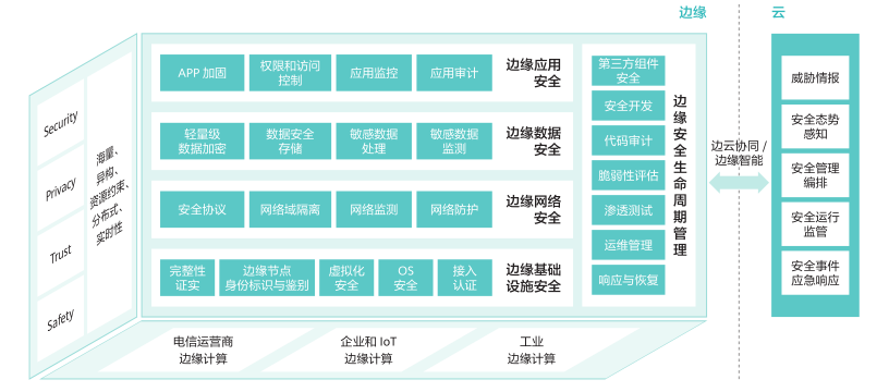 邊緣安全是邊緣計(jì)算的重要保障。邊緣安全涉及跨越云計(jì)算和邊緣計(jì)算縱深的安全防護(hù)體系,只有增強(qiáng)邊緣基礎(chǔ)設(shè)施、網(wǎng)絡(luò)、應(yīng)用、數(shù)據(jù)識別和抵抗各種安全威脅的能力,才能為邊緣計(jì)算產(chǎn)業(yè)的發(fā)展構(gòu)建安全可信環(huán)境。邊緣安全的核心價(jià)值體現(xiàn)在可以提供可信的基礎(chǔ)設(shè)施:主要包括計(jì)算、網(wǎng)絡(luò)、存儲類的物理資源和虛擬資源?;A(chǔ)設(shè)施是包含路徑、數(shù)據(jù)交互和處理模型的平臺面,可以應(yīng)對鏡像篡改、DDoS 攻擊、非授權(quán)通信訪問、端口入侵等安全威脅。