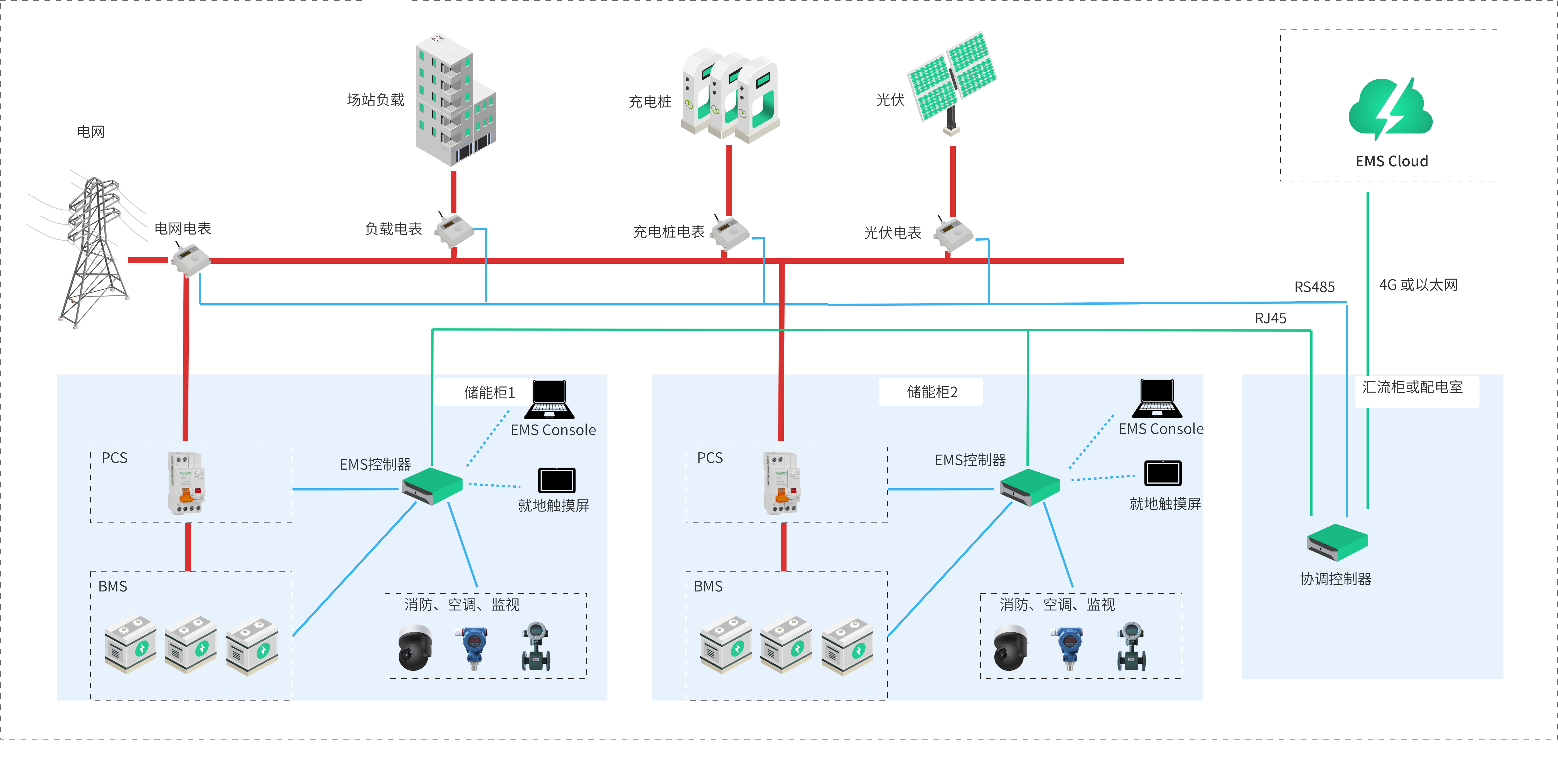 所有柜體內只有一個控制器,并放置于主柜中,主柜EMS控制器通過以太網與所有從柜進行通訊交互,從柜中安裝采集或者轉換裝置,用于在主柜控制器與從柜各組件設備之間做數據轉發。