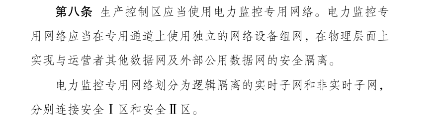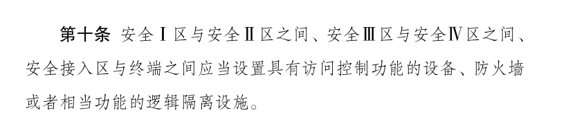 ? ? ? ? 其中第八條和第十條首次提出了邏輯隔離的概念,提到生產(chǎn)控制區(qū)應(yīng)當(dāng)使用電力監(jiān)控專用網(wǎng)絡(luò),劃分為邏輯隔離的實(shí)時(shí)子網(wǎng)和非實(shí)時(shí)子網(wǎng),分別連接安全Ⅰ區(qū)和安全Ⅱ區(qū);安全Ⅰ區(qū)與安全Ⅱ區(qū)之間、安全Ⅲ區(qū)與安全Ⅳ區(qū)之間、安全接入?yún)^(qū)與終端之間應(yīng)當(dāng)設(shè)置具有訪問(wèn)控制功能的設(shè)備、防火墻或者相當(dāng)功能的邏輯隔離設(shè)施。