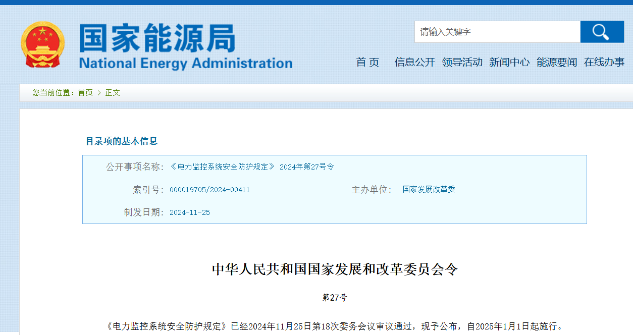 ? ? ? 近日,國(guó)家發(fā)展改革委頒布了新修訂的《電力監(jiān)控系統(tǒng)安全防護(hù)規(guī)定》(國(guó)家發(fā)展改革委2024年第27號(hào)令,以下簡(jiǎn)稱27號(hào)令),自2025年1月1日起施行,原《電力監(jiān)控系統(tǒng)安全防護(hù)規(guī)定》(國(guó)家發(fā)展改革委2014年第14號(hào)令,以下簡(jiǎn)稱27號(hào)令)同時(shí)廢止。