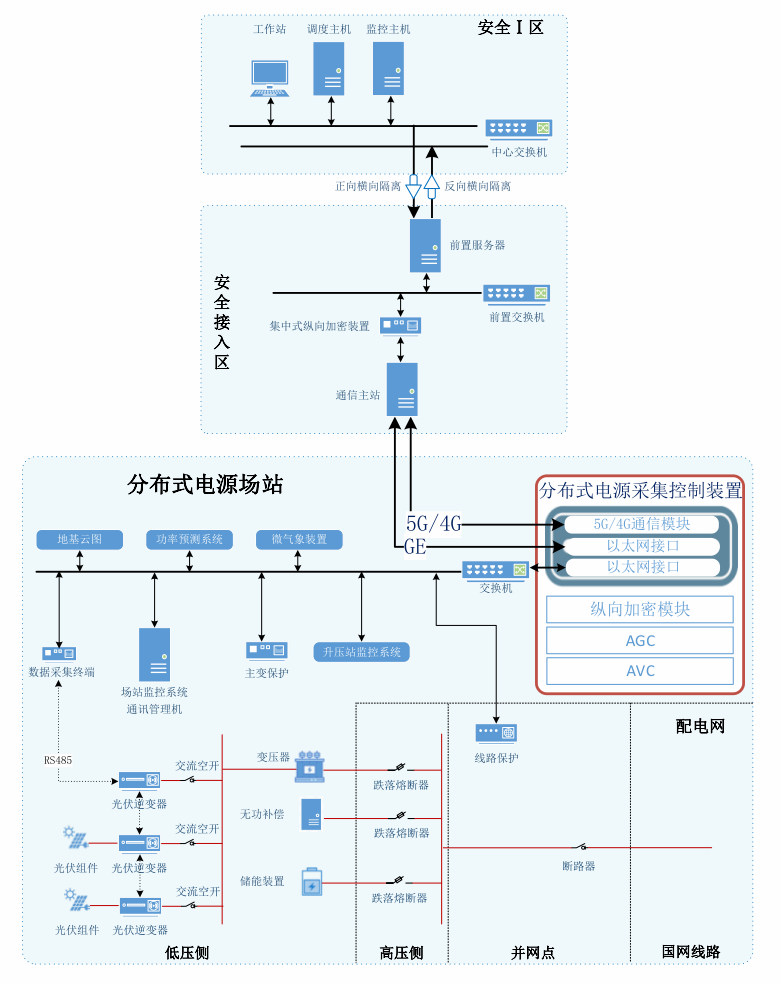 ???該裝置部署于分布式電源場站側(cè),基于無線專用通信網(wǎng)絡架構(gòu),集成縱向加密單元、無線通信模塊及 AGC/AVC 控制功能,通過電力專用通信通道接入生產(chǎn)控制大區(qū)安全接入?yún)^(qū),與調(diào)度主站建立安全通信鏈路,實現(xiàn)數(shù)據(jù)傳輸?shù)目煽啃耘c安全性。