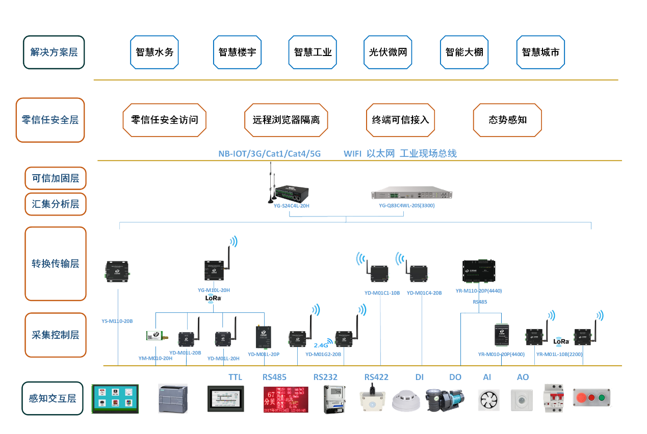 ? ? ? 在采集控制層,使用LORA技術讓設備的信號覆蓋更強,同時具備組網功能,解決了采集設備數量多、距離遠、分布廣的問題,針對遠程控制的需求,提供4G LTE系列數傳設備,保證了設備的云平臺遠程連接能力,針對部分客戶對通訊的可靠性、實時性的要求,也推出了RS485和本地以太網的通訊組網方案,解決了電磁干擾嚴重的場景的通訊問題,同時也滿足了部分用戶對數據時效性要求高的需求;