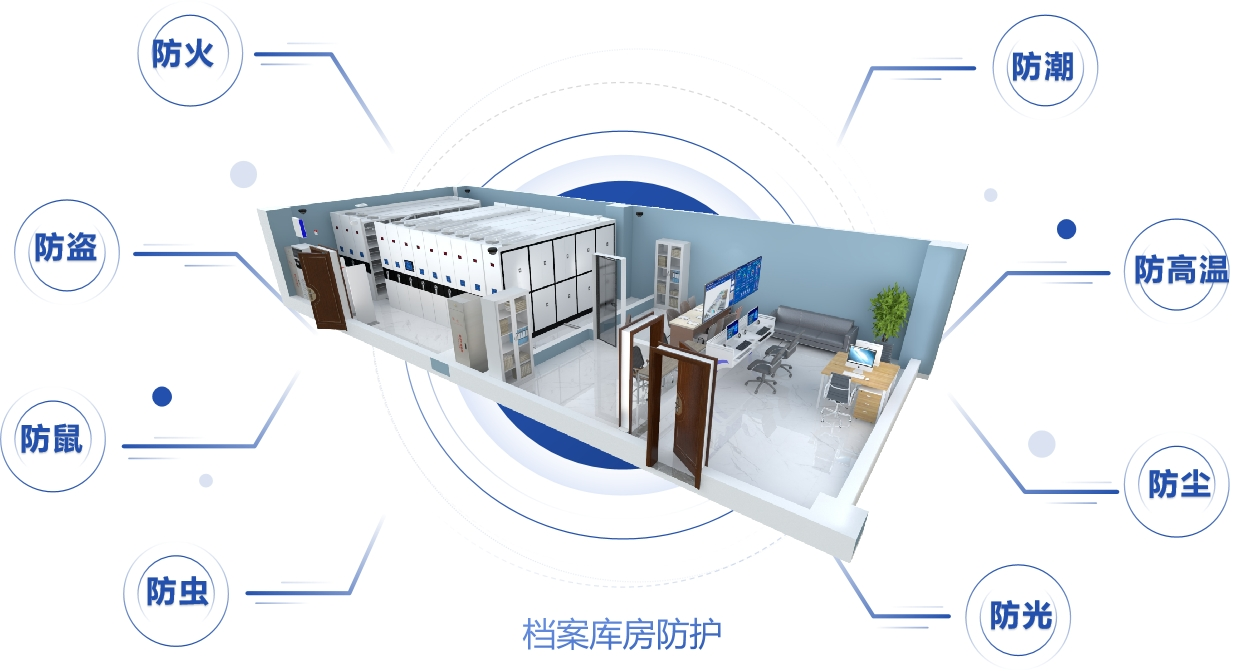 云涌科技智能環境控制綜合管理系統通過智能設備采集所有庫房內的溫度、濕度、漏水、人員侵入等數據,并通過自動模式控制空調、除濕加濕凈化一體機、電動窗簾、燈光、新風機等智能設備,達到自動調節溫濕度及空氣凈化的目的,實現了庫房內空氣質量的智能管理,保護了檔案本身安全和從業人員的身體健康。同時接入視頻監控系統,實時監控檔案庫房實時內畫面;出入口部署門禁控制設備,通過指紋、門禁卡、密碼等方式控制人員的進入,只有有權限的管理人員才能進入,有效保證檔案實體的安全。