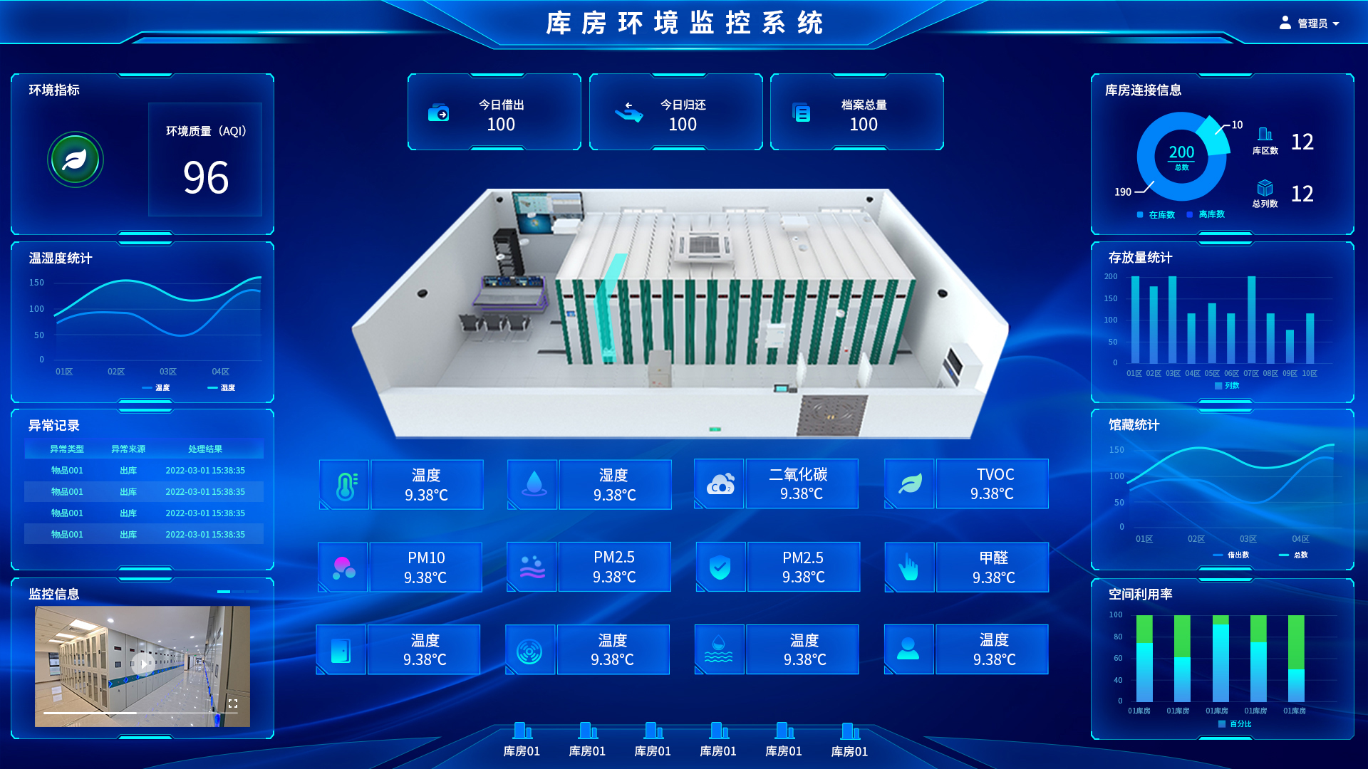 系統配置視頻監控、紅外探測器、門禁管理設備,通過系統統一管理調度,可與系統其他設備聯動運行,保障庫房安全,同時對庫房內的空氣質量狀況進行了有效的監測、控制以及治理,自動調節、過濾、凈化,時刻保證庫房內空氣質量的健康、穩定
